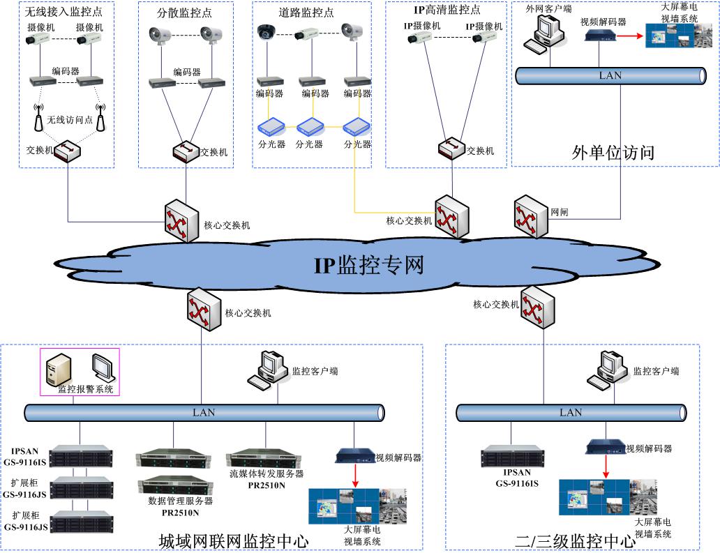 ●前端全部采用数字摄像机,区分局、派出所、市局、县局的视频数据采用集中存储,各分控中心分布式存储。