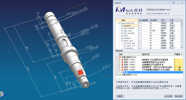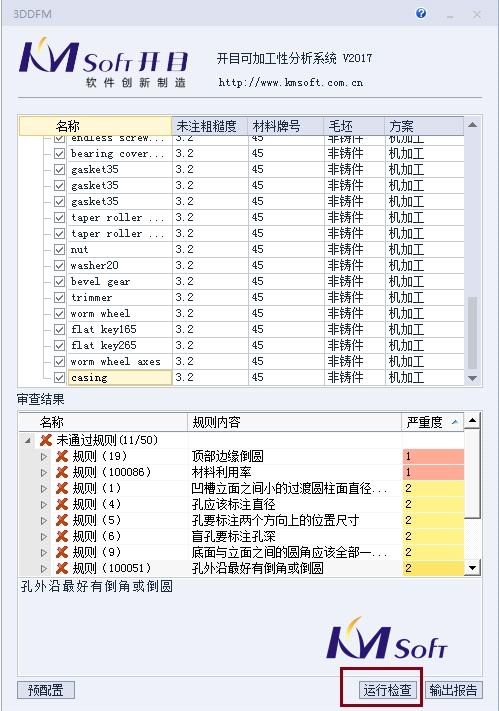 3DDFM客户端操作简单、易用,主要功能按钮包括:预配置、运行检查、输出报告。操作者可以通过"运行检查"按钮进行一键式检查,检查结束后,分类显示未通过项、通过项,以规则分类的方式进行分别展示。通过与三维CAD的无缝集成,在3DDFM中选中不合格项时,系统自动定位到相关联的加工特征,并高亮显示。检查后,系统自动缓存检查结果(也可以通过选项关闭该功能),在下次系统启动时无需再次检查,直接显示上次检查结果,当被检查零件发生变化时系统高亮行提示进行重新检查。