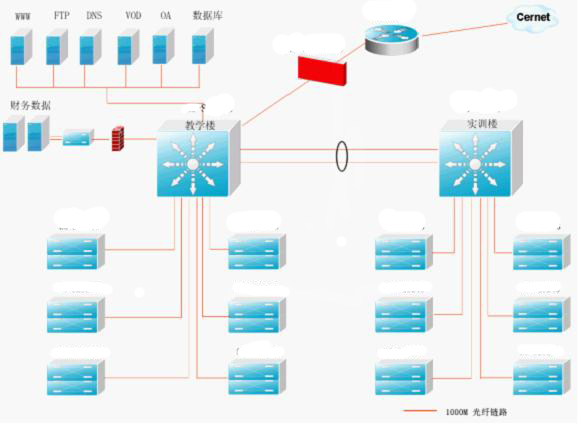 基于目前学校规模及发展的角度考虑,骨干网络采用单核心双引擎或双核心单引擎的拓扑结构,保证核心的稳定;在两栋实训楼采用万兆的三层汇聚设备,实训楼千兆连接接入交换机;服务器千兆接入到核心交换机上;百兆到桌面;