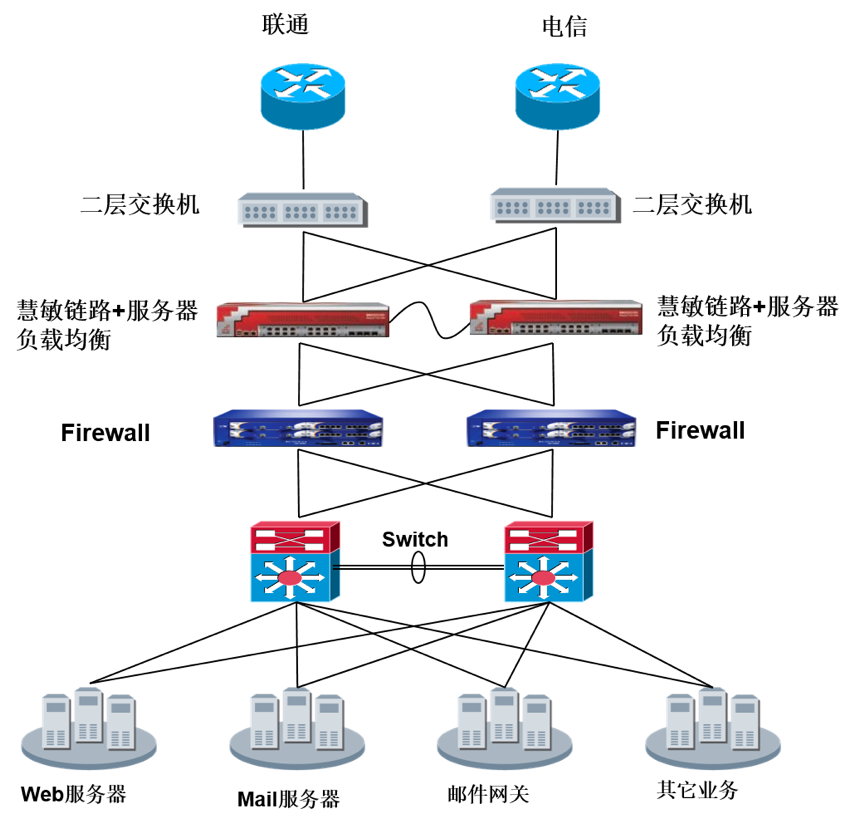 2.链路负载均衡和冗余:要求在正常情况下将用户对外的访问流量和外部用户对内部服务器的访问流量负载均衡到多条链路上,在某链路故障时自动将其流量切换到另外的链路,自动的透明容错,当链路恢复时自动将其加入到负载均衡中来。