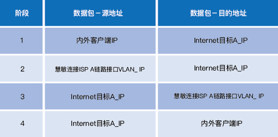 下面我们通过出向数据包的处理流程来描述链路负载均衡的工作原理。例如,当出向流量数据到达慧敏设备时,它会基于链路的健康状况,同时根据选路策略(即预设的链路负载均衡算法)决定将流量负载均衡调度到哪一条链路。链路决策完成之后对数据包做相应的SNAT处理,数据包的源地址会自动转换成相应ISP提供的公网地址后转发至Internet,这样可以保证响应数据包按照期望的链路返回到慧敏设备。而慧敏系统中存留此TCP连接的SNAT对应关系,通过查表再将返回数据包的目的地址恢复成内部发起端的内网IP,然后转发给内部的用户终端或服务器。