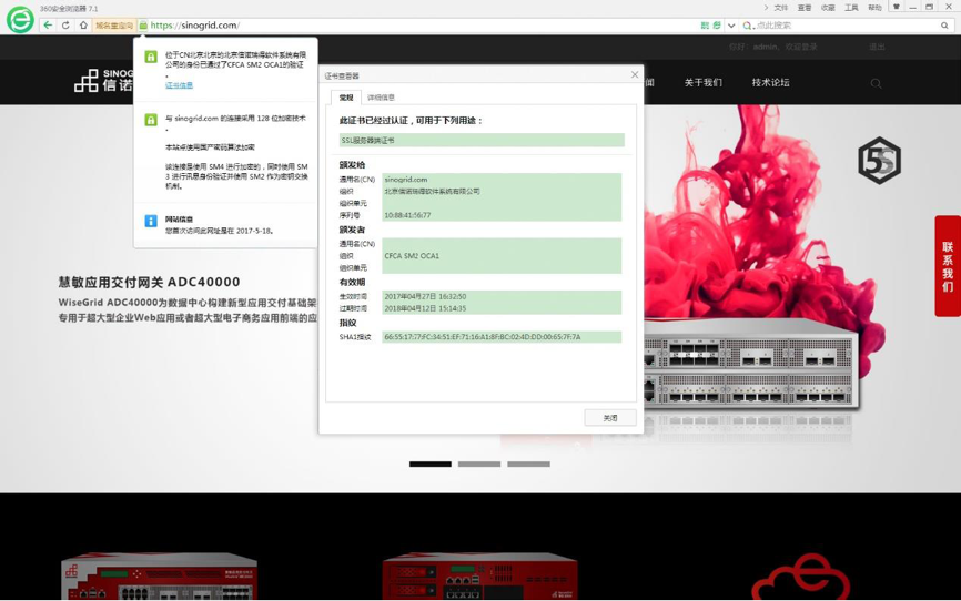 同时,慧敏应用交付网关也实现了国密双证书的SSL握手协议,并且与国内首个支持国产密码算法的浏览器“360安全浏览器国密专版”成功实现国密算法联调。有了国密算法的浏览器的支持,使信国产密码算法的实际应用环境获得极大的改善。