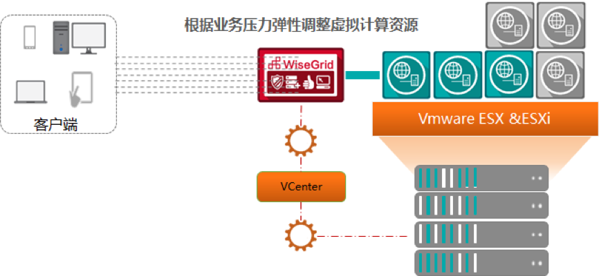 弹性计算是云计算环境中的一个重要特征,它可以根据工作负载的需求,动态、灵活调整服务器计算资源,弹性计算真正使云计算中心具备智能性,最终为用户提供按需所求的服务。WiseGrid 慧敏应用交付网关将流量管理、资源调度与虚拟化技术紧密结合,通过与云计算虚拟机管理平台的集成,为云计算环境提供一个完整的弹性计算解决方案,并成为解决方案中不可或缺的重要组成部分。