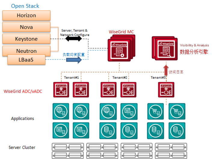 慧敏应用交付网关完全依照OpenStack Neutron LBaaS v2.0 标准实现与OpenStack管理平台紧密集成。OpenStack Neutron LBaaS作为Neutron项目的高级服务之一,能够确保工作负载以可预见的方式分配到这些实例中,从而达到更高效的使用系统资源的目的。通过在OpenStack网络节点部署慧敏产品的专用Nertron LBaaS 插件,将Neutron LBaas的API适配到慧敏应用交付网关自有的API。此时,慧敏应用交付网关设备将作为OpenStack管理平台的管理资源,不再需要独立管理即可完成负载均衡的业务管理。